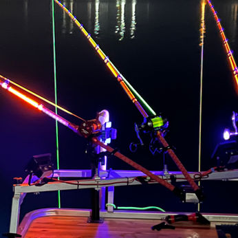 My boat is equipped with LED black lights for night fishing so you can clearly see rods and lines when your fish strikes (see photo)